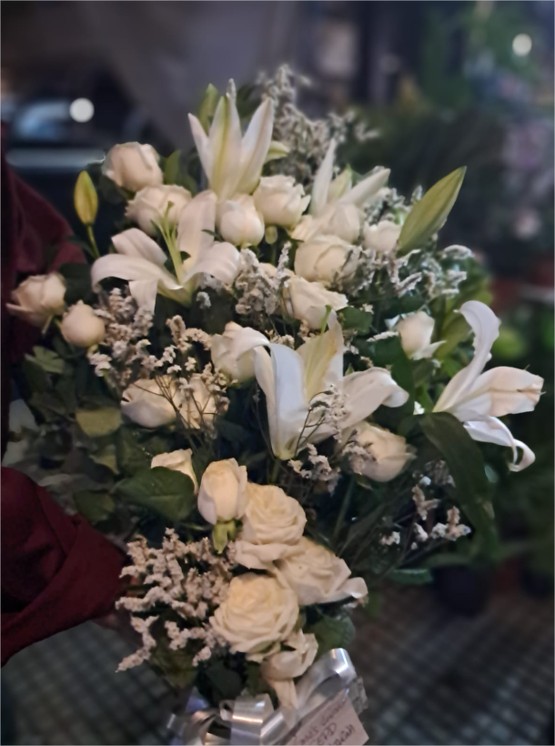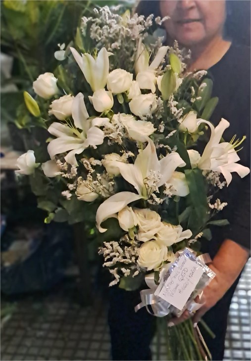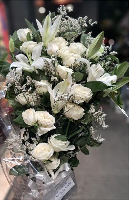 Bouquet funerario de 24 rosas blancas y lilium más acompañamiento