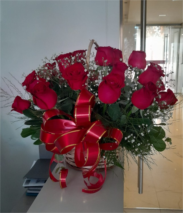 Canasto de 24 rosas rojas, gypsofila y follaje